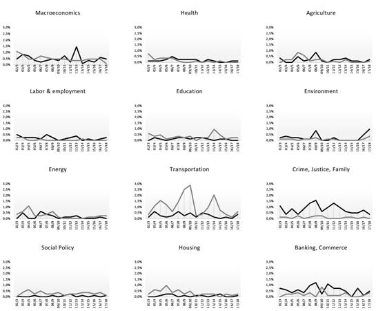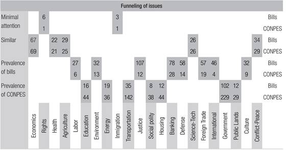 Finally, we review the strategic channeling of issues according to the two instruments. Each instrument offers different information and its own structure of opportunity that affects the allocation of attention to policy issues (Larsen-Price, 2012). Therefore, each type of document is an intervention channel that can be used strategically by the president according to the information he has about the policies, the political process, and each of the instruments.
