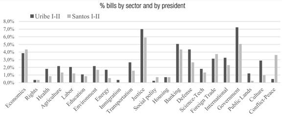 As we saw in the theoretical discussion, it is quite possible that the presidential agenda privileges some issues over others. Presidents are expected to address issues that are constitutionally and legally binding on them, as well as economic issues, but the agenda is also expected to have their own stamp. These two expectations seem to be confirmed by Uribe’s and Santos’ use of bills, with government and economic issues appearing in the highest percentages in both presidents.