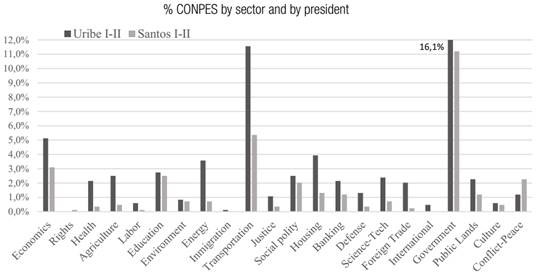 From Santos’ side, the issues with the highest number of bills are justice, government, economy, banking and domestic trade, foreign trade, conflict and peace, and defense. While through CONPES it has the largest numbers in government, transportation, economy, education, conflict and peace, social welfare, and housing. As in Uribe, Santos also has common themes between instruments, government, economy, and conflict and peace, and different themes.
