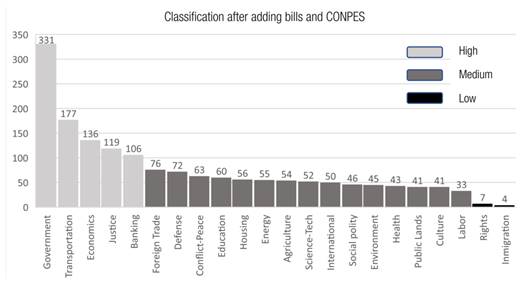 The types three and four together constitute 15 of the 22 topics analyzed, demonstrating the importance of the analysis of presidential political attention, not only by sector, but through the channels used by the executive. In eight topics, the analysis of bills is decisive for the realization of the respective policies, while in seven CONPES are decisive, which has been a policy instrument traditionally undervalued by the Colombian academia. We emphasize that through CONPES the numbers are greater particularly in certain types of issues: education, energy, transportation, housing, united by the particularity that they are CONPES that involve either allocation of resources, or specific infrastructure, which is usually in charge of the executive.