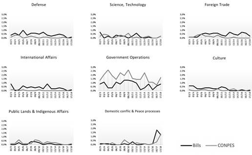 Among the other issues, the personal stamp also stands out. In Uribe’s case, as we saw before (Box 1), his main priority was democratic security, and this is reflected in the prevalence of the defence sector among the bills, which does not appear, for example, in Santos, who, on the contrary, privileged the policy of peace through dialogue, which is reflected in both bills and CONPES. In Santos’ case, his attention to peace is evident in the two instruments.