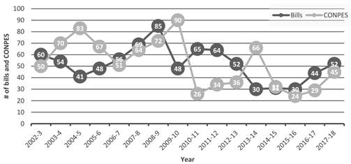 While this article has mainly descriptive and exploratory purposes, we assume the above statement as a general working hypothesis to analyze the interaction between presidential attention to both policy issues and instruments. We argue that the character of the instruments does affects the prioritization of issues, and that the presidential decision process to combine issues and instruments is also influenced by other contextual and institutional factors such as the character of the presidency and the political time. That is the reason we chose bills and CONPES. The former are mediated by Congress and the latter are unilateral, which allows us to explore whether there is a differentiated use of both, in relation to the information they provide and to political time (honeymoon or lame duck time), which would suggest a channeling of issues differentiated by instruments, and a strategic behavior of the presidents.