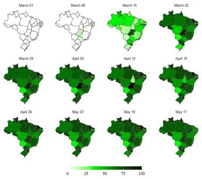 Figure 1 depicts the evolution in the level of the Social Distancing Policy Stringency index in each Brazilian state in the twelve weeks from March 1 to May 23, 2020. The darkest colored states in each map are the states with the highest intensity in the stringency level of social distancing in that specific week.