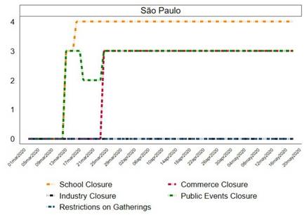 Figure 2 provides an overview of the timing and stringency level of the policies adopted in the state of São Paulo. The richest and most populous state of Brazil, São Paulo was the pandemic’s Brazilian epicenter from March to May 2020. São Paulo issued orders to mandate school closures by March 16. Commercial activities were also closed, but industry closures were never issued. There were no mandates issued to prohibit public gatherings; the state’s government issued only recommendations, and no restrictions were placed on private gatherings. Although it was a pioneer in the early adoption of non-pharmaceutical interventions, the state ended the month of May being among the least stringent states in the federation. By then, there were already announcements of the further lifting of measures in the coming weeks, especially in commerce and activities regulations, that were the object of protestations by private parties. Even though, the alarming fact remains that the state led in daily cases and deaths in this period.