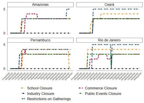 Figure 3 plots the evolution in the Social Distancing Policy Stringency (SDPS) Index for the four states with the highest number of deaths per 100,000 people. This figure highlights that the state of Rio de Janeiro was the first of these to react. Ceará adopted the strictest measures as it was the only to close industries. There is considerable heterogeneity in the measures adopted by each of the four states, especially in Rio, where there were many policy changes.