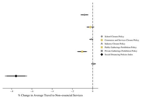Figure 6 depicts the long-term effects of social distancing policies on the change in non-essential trips. A package of stringent social distancing policies produces a reduction of 0.76% (or between -0.87 and -0.65 using a 95% confidence interval) in the trips made for non-essential services relative to the baseline.