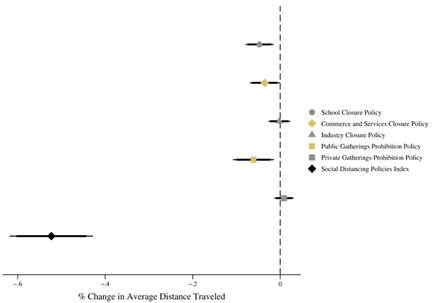 Figure 7 shows the long-term effects of social distancing policies on the change in average distance traveled in the state. As in the case of the other compliance measures analyzed, a package of rigorous social distancing policies reduces the average kilometers traveled in a day by 0.52 (or between -0.62 and -0.43 using a 95% confidence interval) relative to the baseline.