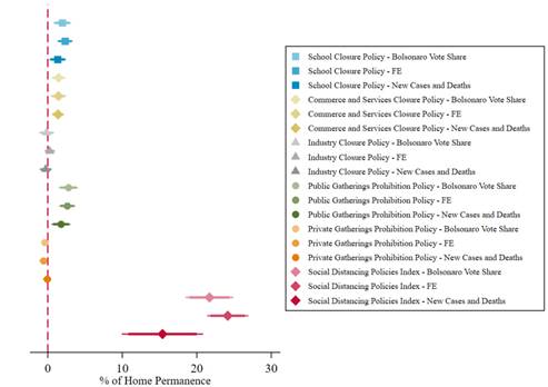 As the pandemic continued to exact a decisive and deathly impact across Brazil, nevertheless, our study also confirms that these policies were relatively moderate. Similarly, the permanence at home peaked in the last weeks of March. Since then, even though non-pharmaceutical intervention policies remained in place, mobility patterns gradually increased. Our results show that although mobility patterns did not return to pre-pandemic levels, significant increases took place. Furthermore, the pace of this movement in mobility can be linked with the policies adopted by state governments. By allowing commerce, services, and industry to remain open, consumers are shopping, and workers traveled to work. Our results suggest that the effectiveness of non-pharmaceutical interventions to increase social distancing is stronger when comprehensive measures are put into place and sustained over time. Small changes in specific non-pharmaceutical interventions, holding all else equal, had a limited impact on mobility.