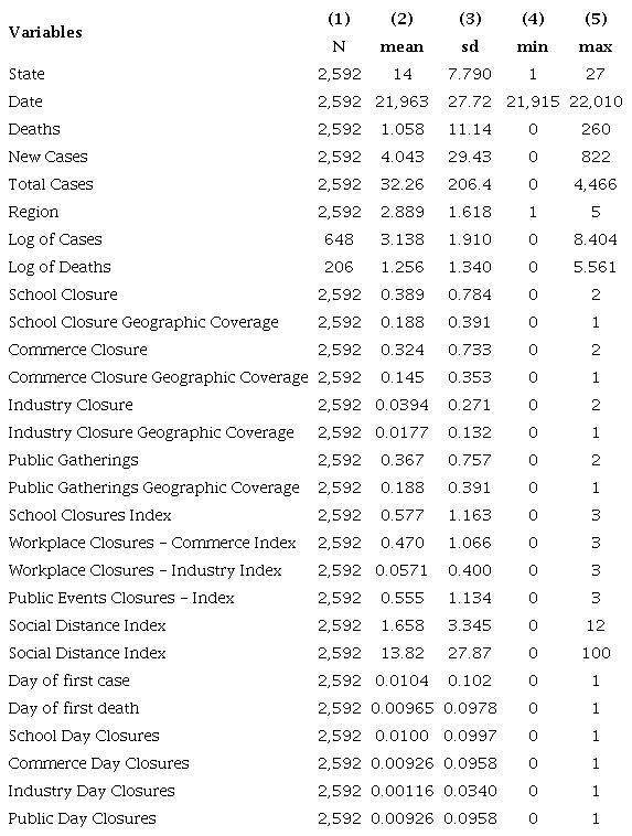 Following the OxCGRT coding, policy decisions regarding social distancing for variables SDP1, SDP2A, and SDP2B receive a score of 1 (one) if they recommend closures, 2 (two) if the closure is mandatory, but non-essential services are permitted to operate within the state’s jurisdiction, and 3 (three) if the suspension becomes mandatory for all levels and sectors. In case there are no closure mandates in place, a score 0 (zero) was assigned. We consider non-essential services as referring to activities that are not specifically related to either the health or food sectors. For the public gatherings (SDP3), policies are scored from 0 (zero) to 2 (two). Lastly, private gatherings and events (SPD4) receive a score of 1 (one) when there is a restriction on gatherings of over 1000 people, 2 (two) if there are restrictions on gatherings between 101-1000 people, 3 (three) if there are restrictions on gatherings between 11-100 people, and 4 (four) if there are restrictions on gatherings of up to 10 people. Furthermore, each policy is also coded for its geographical coverage. If the closure policies are directed at the entire state, these policies receive a geographical target score of 1 (one), and if the policy are geographically targeted for specific hot spots a score of 0 (zero) is assigned. Finally, each policy receives a combined score, considering the two dimensions. Additionally, the four social distancing indicators were then summed to get a composite Social Distancing Policy Stringency measure, and this measure was re-scaled to create a composite Social Distancing Policy Stringency (SDPS) Index that ranges from 0 (no policy intervention) to 100 (maximum level of intervention)8. As we carefully inspected all government decrees and therefore clearly identified mandated versus recommended closures as regulated in laws, there are no missing data for these indicators in the CGRT-BRFED data set9.
