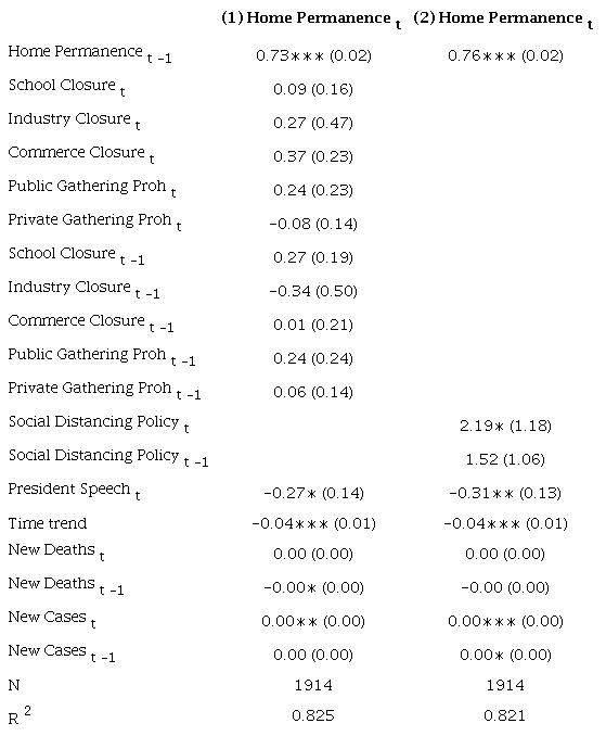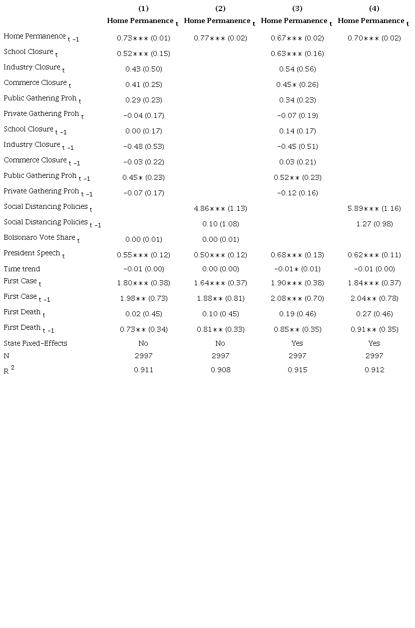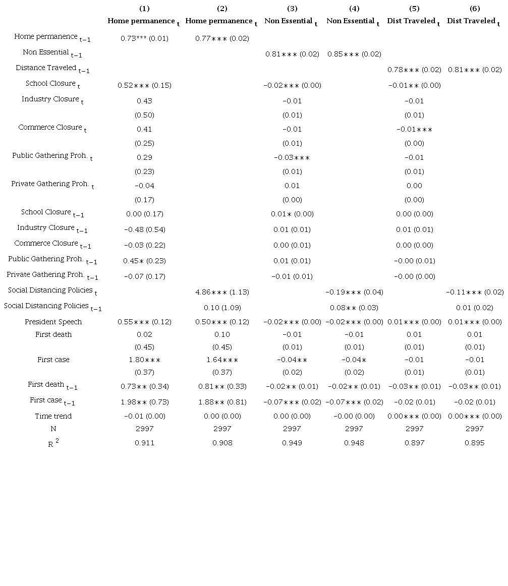 In this section, we use time-series cross-sectional analysis to examine the impact of the level of stringency of the social distancing policies adopted by Brazilian states to examine whether mobility depends on the rigidity of the types of measures enacted. We estimate autoregressive distributed lag models (ARDL) to examine the impact of social distancing policies on mobility (Equation 1). Our dependent variable is mobility. We employ three different measures: home permanence, non-essential trips, and distance traveled. Our key independent variable is a composite measure of social distancing policies.