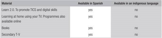Most of the materials available whether online, in print or on video, are in Spanish, with a reduced number of materials available in indigenous languages. These results are similar to those of INEE (2017), which makes reference to the lack of relevant or local language materials needed for class. Likewise, access to information and communication technologies, such as smart TVs, cell phones, and the Internet-precisely the type of gadgets and services that are crucial to education in COVID-19 times- is significantly lower in indigenous households in comparison with the mainstream population. As a result of this, the perpetual inequality in educational services for impacted groups in our country is aggravated by the lack of material, available remotely, in all Mexican indigenous languages. This may be considered as a form of discrimination, esp., when we consider the resources available for Spanish speaking students (CONAPRED, 2011). Furthermore, even if the amount of educational services and resources allocated to alleviate the effects of COVID-19 on education were the same for everyone, inequality of access by vulnerable ethnic groups would limit their effectiveness considerably