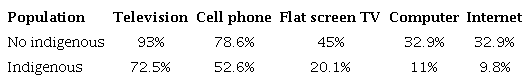 This state of vulnerability in which IP live has an impact on all aspects of IP’s lives. As an example of this, The INEGI (2015) indicates that the coverage of the electric energy service is 95.7% in the homes of IP, while for the rest of the nation, access is 98.7%. Thus, access to electricity, a commodity in almost all households in the country, shows a difference of three points between the non-indigenous and indigenous population. Another example has to do with access to information and communication technologies (ITC) in homes, which at the national level is described in table 1.