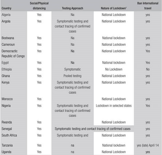 The policy responses have been similar across Africa. Almost all countries have implemented measures for social/physical distancing, mass or symptomatic testing, compulsory quarantine or isolation for suspected or confirmed cases, partial or full suspension of international travels and economic palliative measures.