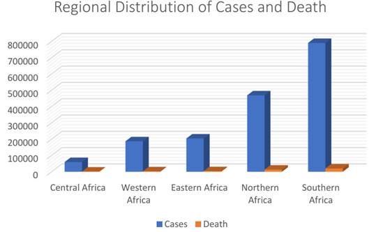 There are also regional disparities within the continent. Figure 2 presents the spread of cases and death across the sub-regions within the continent. The chart shows the disparities across the sub-region, and when considered alongside Figure 1, they further confirmed argument around the domination of some regions on the manifestation of the pandemic.