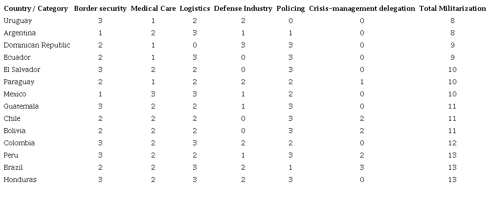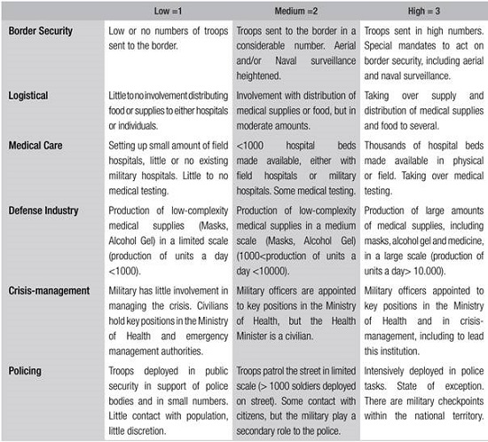 Consistent with academic reporting on the issue, the first point to be made is that no democracy in Latin America resisted the urge to draft their military for COVID-19 tasks (Red de Seguridad y Defensa de América Latina [RESDAL], 2020). Table 1 summarizes our descriptive results, according to the following classification: 1 (low), 2 (medium) and 3 (high).