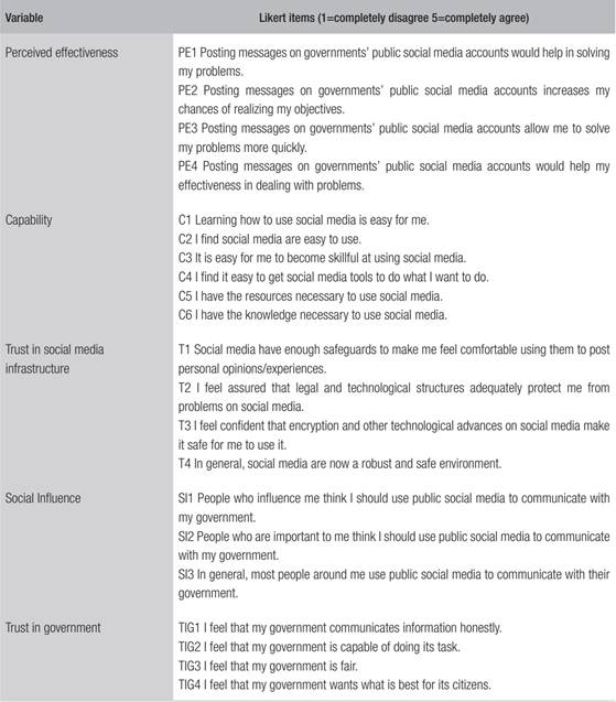 Performance expectancy was measured using four Likert items. An example of an item is “Posting messages on governments’ public social media accounts would help in solving my problems” (Venkatesh et al., 2003). Capability was measured using six Likert-items. An example of such an item is “I find social media are easy to use” (Bamberg & Schmidt, 2003; Venkatesh et al., 2003). Social influence was measured using three items (Homburg et al., 2020), with “In general, most people around me use public social media to communicate with their government” being an example. Social media anxiety is measured using seven items adapted from (A. Osman, Barrios J. R. Osman, Schneekloth & Troutman, 1994). An example of an item is “Doing what the characters in the stories did could cause serious problems”. Trust in social media technological and business infrastructures were measured with three items slightly adapted from Carter and Bélanger (2005) and Zhou (2011). An example of an item is “I feel assured that legal and technological structures adequately protect me from problems on social media”. Trust in government was measured using items that were adapted from McKnight et al. (2002). An example of an item is “I feel that my government communicates information honestly”. All questionnaire items are reported in Appendix (Box B).