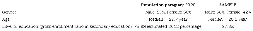 A total of 298 useful responses were recorded in the survey. Table 2 displays a comparison of sample characteristics and known estimates of the same characteristics in the Paraguayan population. Even though there is a small but notable difference in education in the sample and known 2012 estimates of the population level of education, and taking into account that in the practice of research every sample shows some kind of sampling error, we decided not to post-stratificate or discard the sample and to include all 298 responses in the analysis.