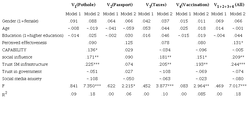 This leads us to the following conclusions regarding our hypotheses: we found limited support for hypotheses one (perceived effectiveness) as in the ‘pothole’-vignette, as well as in the combined responses, significant correlations could be observed. Hypotheses three (social influence) received support (on the basis of support in three out of four vignettes, and all vignettes combined; hypothesis four (trust in social media infrastructure) received support on the basis of support in three out of four vignettes, and all vignettes combined. Hypotheses two (capabilities), five (trust in government) and six (social media anxiety) received no support.