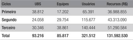 Conforme o Quadro 1, a implementação do PMAQ-AB se converteu em três ciclos programáticos. No primeiro (de outubro de 2011 a janeiro de 2013), o MS firmou convênio com seis IEPs; no segundo (de fevereiro de 2013 a setembro de 2015), com sete; no terceiro (de outubro de 2015 a maio de 2019), com nove. O custo total da avaliação externa foi, em média, 1.411,69 reais por UBS, para aplicar questionário de verificação da unidade e entrevistas com equipes e usuários, considerando todos os ciclos do programa. Durante esses ciclos, a quantidade de equipes aumentou progressivamente, sobretudo depois da universalização do programa no segundo ciclo. Portanto, os recursos financeiros transferidos às IEPs foram incrementados e houve ajuste nos recursos financeiros para assegurar a equivalência entre as IEPs, considerando questões de acesso, nova distribuição de UBS/equipes visitadas e aquisição de equipamentos tecnológicos.