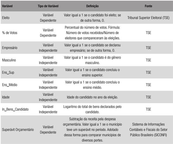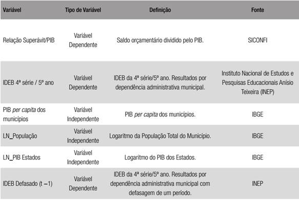 O período de análise dos fatores determinantes para o sucesso eleitoral compreende a eleição municipal de 2012. Para o desempenho dos prefeitos eleitos, foi analisado o período de 2013 a 2016, e os indicadores utilizados foram o superávit orçamentário e o IDEB da rede de ensino administrada pela gestão municipal. As variáveis utilizadas constam do Quadro1.