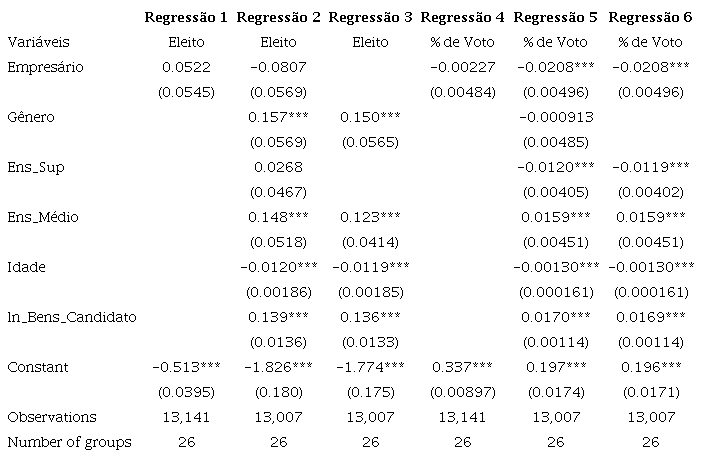 Os modelos de regressão 1, 2 e 3 têm como variável dependente o sucesso eleitoral (1, se o candidato foi eleito). O modelo 1 tem como única variável explicativa o fato de ser empresário; o modelo 2 tem todas as variáveis que se pretende estudar nesta parte do artigo; por sua vez, na regressão 3 encontram-se somente as variáveis significativas. Os modelos 4, 5 e 6 seguem o mesmo raciocínio, mas a variável dependente é o percentual de votos recebidos por cada candidato.