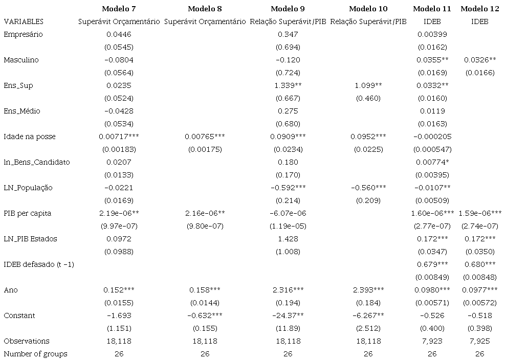 A variável “empresário” não foi significativa para elucidar o desempenho dos prefeitos em nenhum dos modelos testados. Nesse sentido, não houve nenhuma resposta empírica que justificasse a presença de um grande número de empresários no pleito eleitoral, pois essa variável não se mostrou importante para explicar nem a eleição, nem o resultado fiscal dos prefeitos e do IDEB dos alunos da rede municipal de ensino.