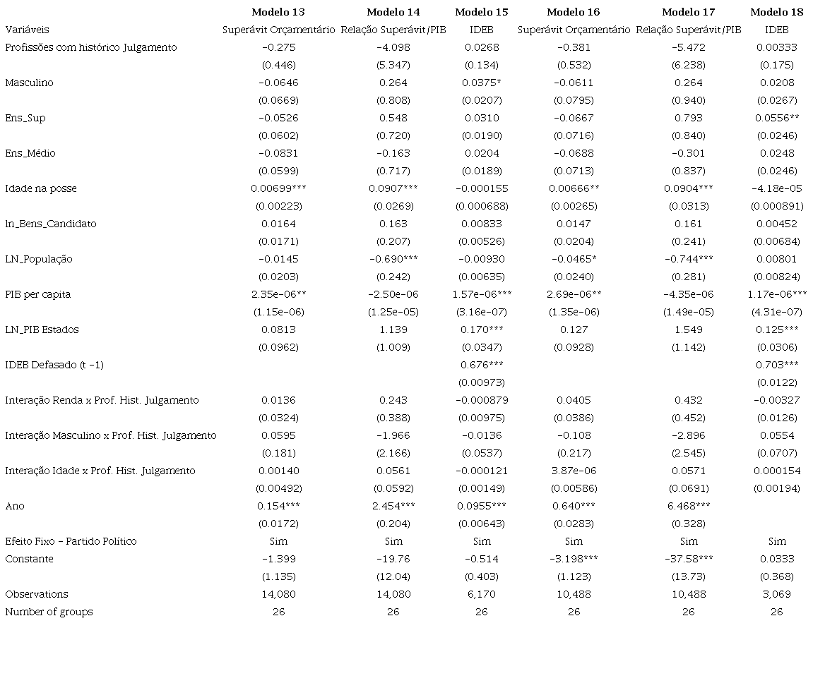 Como forma de dar maior confiabilidade e robustez à pesquisa, foi realizada uma série de regressões com mudanças nas especificações dos modelos. Os resultados são reportados na Tabela 3. A principal mudança se dá em relação à variável explicativa (empresário), que foi substituída por “profissões com histórico de julgamento”. Aqui, além dos prefeitos que se declararam como “empresário”, foram incluídos os que se denominaram “comerciante”, “comerciário” e “diretor de empresas”. Além disso, foram excluídas todas as observações em que não é possível identificar se o prefeito tem histórico de empresário, quais sejam: as que identificavam, como profissão, “deputado”, “prefeito” e “vereador”. Para mais, incluiu-se “partido político” como variável de controle. Com o objetivo de suprir quaisquer eventuais problemas causados pelo corte temporal, nos modelos 16, 17 e 18, foram excluídas todas as observações do primeiro ano (2013). Assim, os resultados que tinham pouca influência na atuação do prefeito foram retirados da pesquisa.