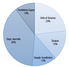 Ressalta-se que, apesar de o Web of Science ter sido a plataforma na qual obteve-se o maior número de resultados, esta representa a segunda maior contribuição entre os documentos que compõem o levantamento bibliográfico. Isso se deve ao número de textos em duplicidade com outras bases, especialmente com a Sage Journals, de onde a maior parte do material foi agregado. Da mesma forma, também foram obtidos resultados duplicados na Scopus, porém, ao contrário do que ocorreu com a Sage Journals, essas repetições não foram suficientes para ultrapassar o Web of Science em número de documentos inclusos, conforme pode ser visto no Gráfico 1.