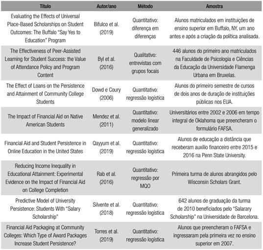 A presente revisão da literatura objetivou identificar padrões de análise das políticas voltadas para a permanência estudantil no ensino superior, as formas de avaliação definidas pelas pesquisas, comparar a eficiência de diferentes tipos de política e verificar quais tipos de instituição têm sido contempladas nas avaliações das políticas de permanência pela literatura.