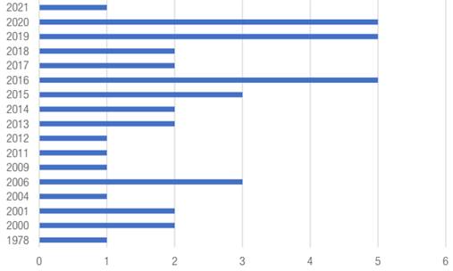Outra observação importante refere-se ao ano de publicação dos textos selecionados. Por causa da ausência de um filtro que limitasse o período dos resultados durante as buscas, existe uma discrepância entre os anos do conteúdo mais antigo (1978) e o mais recente (2021) documento incluído no levantamento. Apesar disso, a maior parte da literatura analisada foi publicada entre 2016 e 2021, tal como se observa no Gráfico 2. Isso indica que as discussões trazidas são atuais, como também reitera a relevância do tema de políticas de permanência estudantil, que apresenta um interesse crescente entre pesquisadores.
