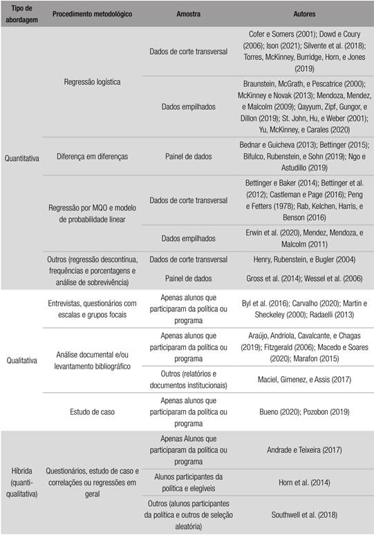 Os estudos incluídos na pesquisa utilizam métodos variados de abordagens quantitativa, qualitativa e híbridas, sendo essa última menos frequente. É perceptível que quando as análises têm foco sobre uma única instituição ou um campus específico, há uma preferência por pesquisas qualitativas, que utilizam como instrumentos mais comuns os questionários e, algumas vezes, entrevistas. Por outro lado, quando o estudo abrange mais de uma instituição simultaneamente, então os métodos quantitativos aparecem com maior destaque. Em particular, a regressão logística é adotada de forma recorrente quando os pesquisadores visam medir efeitos sobre a probabilidade de evasão escolar.