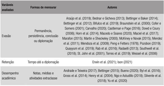 Assim, em alguns casos, a variável de interesse não se limita aos resultados sobre a evasão e inclui os efeitos sobre a retenção estudantil, medida pelo tempo até a diplomação (Erwin et al., 2021; Ison, 2021), e o desempenho acadêmico dos alunos, avaliado por meio de notas, coeficientes de rendimento e atividades extraclasse dos estudantes (Andrade & Teixeira, 2017; Bettinger, 2015; Bueno, 2020; Byl et al., 2016; Gross et al., 2014; Henry et al., 2004; Ngo & Astudillo, 2019; Silvente et al., 2018; Yu et al., 2020).