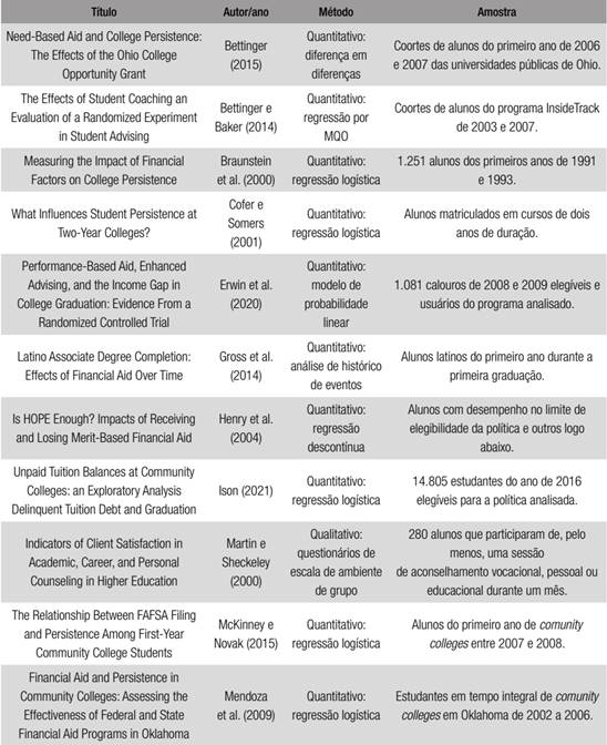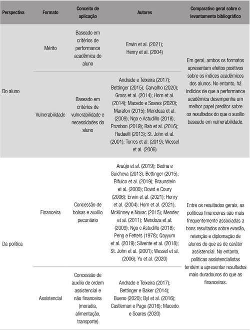 A despeito dessa escassez de pesquisas comparativas, são encontrados trabalhos que discutem separadamente a relevância e os efeitos de políticas públicas de permanência estudantil baseadas tanto em critérios de necessidade e vulnerabilidade financeira dos alunos (Andrade & Teixeira, 2017; Bettinger, 2015; Carvalho, 2020; Gross et al., 2014; Horn et al, 2014; Macedo & Soares, 2020; Marafon, 2015; Mendoza et al., 2009; Ngo & Astudillo, 2019; Pozobon, 2019; Rab et al., 2016; Radaelli, 2013; St. John et al., 2001; Torres et al., 2019) como também na performance e no mérito acadêmico dos estudantes (Erwin et al., 2021; Henry et al., 2004).