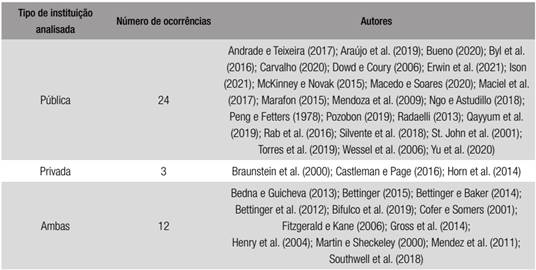Os resultados esperados para esse tópico inicialmente envolviam apenas dois possíveis ambientes de análise: o público e o privado. Porém, algumas pesquisas encontradas foram conduzidas a respeito de políticas aplicáveis às duas classificações existentes e acabaram cobrindo simultaneamente ambos os tipos de instituição (Bednar & Guicheva, 2013; Bettinger, 2015; Bettinger & Baker, 2014; Bettinger et al., 2012; Bifulco et al., 2019; Cofer & Somers, 2001; Fitzgerald & Kane, 2006; Gross et al., 2014; Henry et al., 2004; Martin & Sheckley, 2000; Mendez et al., 2011; Southwell et al., 2018). Apesar disso, a maior parte das pesquisas ainda ocorre em amostras retiradas de uma população universitária pública, conforme pode ser visto no Quadro 4.