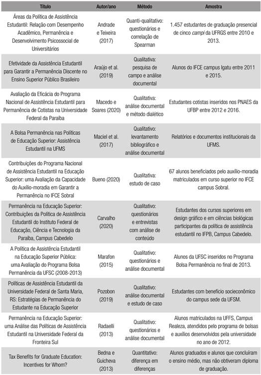 A literatura mostrou que essas formas de auxílio estão presentes tanto em âmbito nacional quanto fora do país, contudo, no Brasil, a maior parte das pesquisas é focada no PNAES, que se traduz em auxílios concedidos com base em critérios de vulnerabilidade socioeconômica dos estudantes e que têm natureza assistencial, ao contrário do que foi encontrado na literatura internacional, que trata com mais ênfase os auxílios financeiros. Essa questão pode ter relação com o fato de que, no Brasil, as pesquisas entre alunos de universidades públicas são mais comuns do que entre aqueles das instituições privadas, às quais a legislação do PNAES não se aplica.