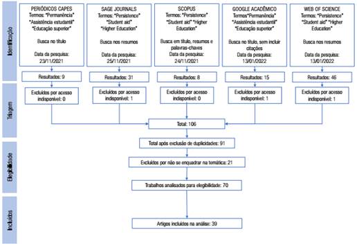Após a exclusão de textos com acesso indisponível, os resultados somados totalizaram 106 artigos, dos quais 15 estavam em duplicidade, assim, restaram então 91 no final da etapa de triagem. Quando passamos para a etapa de elegibilidade, foram excluídos 21 artigos que estavam fora da temática de políticas de permanência estudantil, com isso, o número de documentos foi reduzido para 70. Depois de uma leitura detalhada do material selecionado, foram retirados os artigos que não promoviam uma avaliação ou proposta de avaliação de políticas assistenciais; portanto, no fim, foi incluído na análise um total de 39 trabalhos acadêmicos.