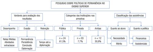 Observou-se que a forma mais comum de avaliação das políticas de permanência é fundamentada em indicadores de evasão, porém, em pesquisas mais abrangentes, os resultados são complementados com indicadores de desempenho estudantil e contagem do tempo até a diplomação. Já em relação às categorias de auxílio estudantil, as políticas podem assumir os formatos financeiro, assistencial, baseados em mérito acadêmico ou por meio de critérios de necessidade/vulnerabilidade dos alunos, sendo apresentadas vantagens e desvantagens, conforme a perspectiva adotada para a classificação. Por fim, em relação ao tipo de instituição mais recorrente nas amostras do levantamento feito, constatou-se escassez de literatura sobre políticas de permanência na rede privada de ensino, apesar de esta representar cerca de 88% do total de instituições de ensino superior ativas no Brasil.