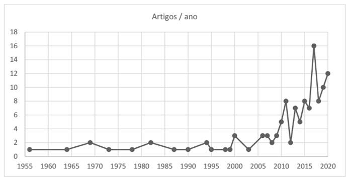 Em uma primeira análise, verifica-se o volume de publicações incluídas nas bases de dados pesquisadas (Scopus e WoS); o primeiro artigo, de autoria de Kellerhals, data de 1956 e foi publicado na revista Veska.