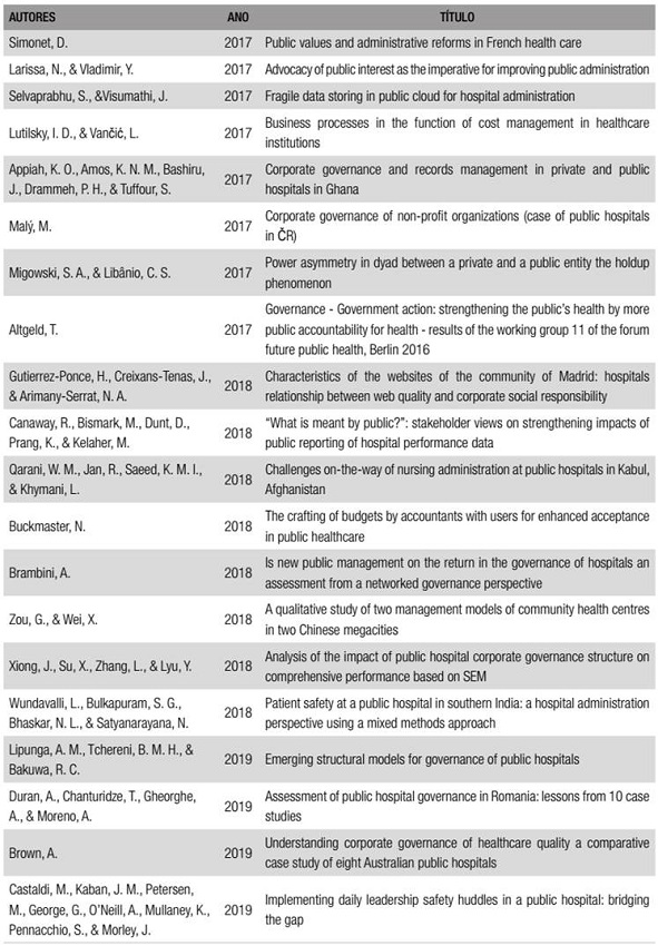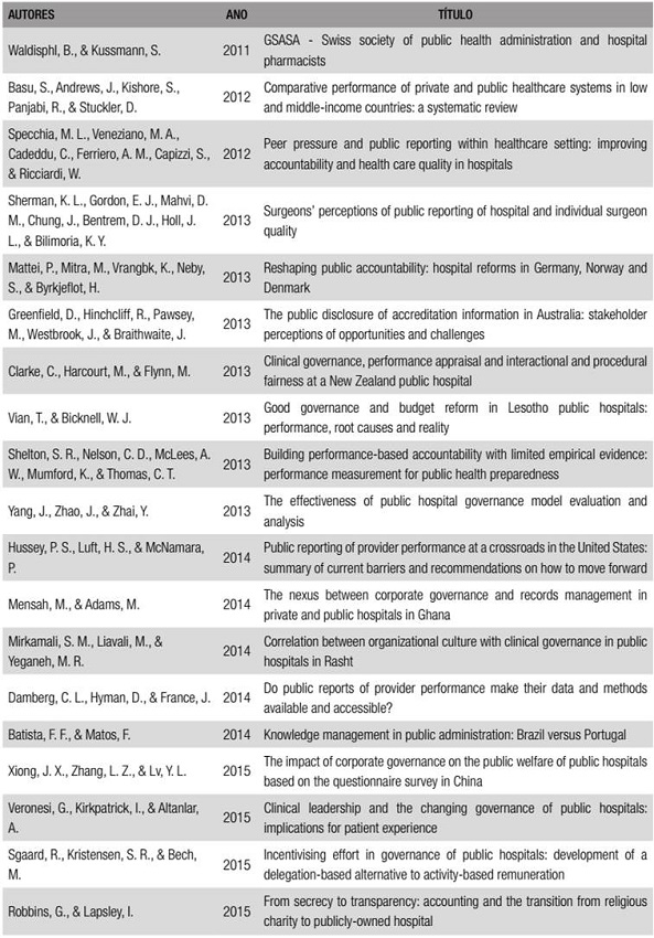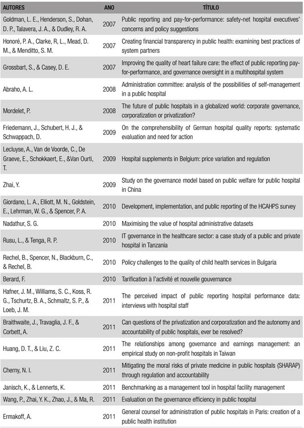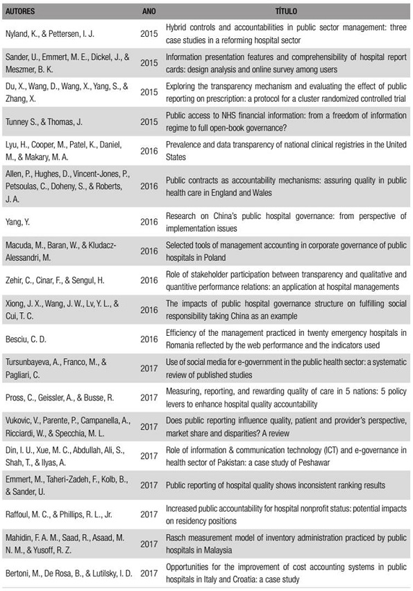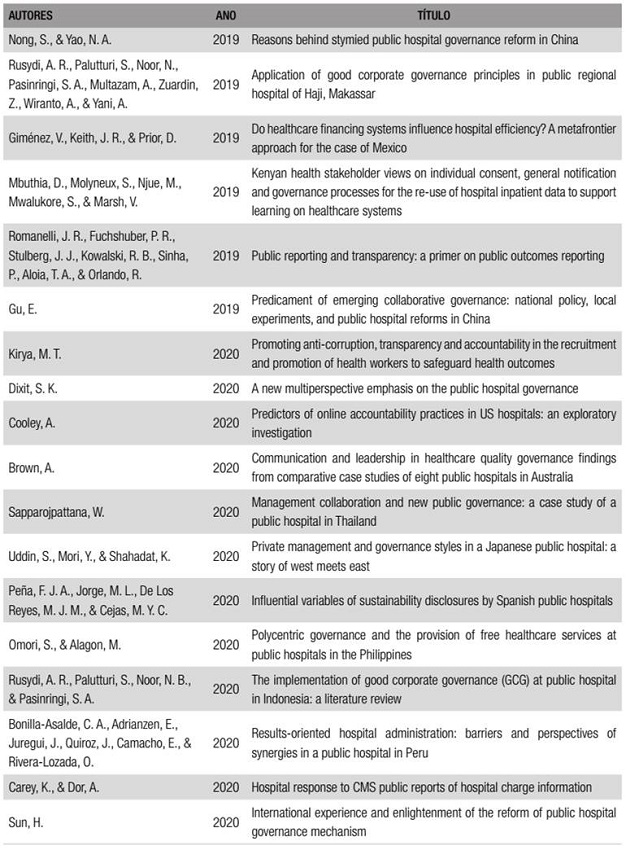 Inclusão de palavras-chave no título dos artigos e nos resultados obtidos: public hospital governance, public hospital administration, public hospital accountability, public hospital transparency, public health governance, public health administration, public health accountability, public health transparency.