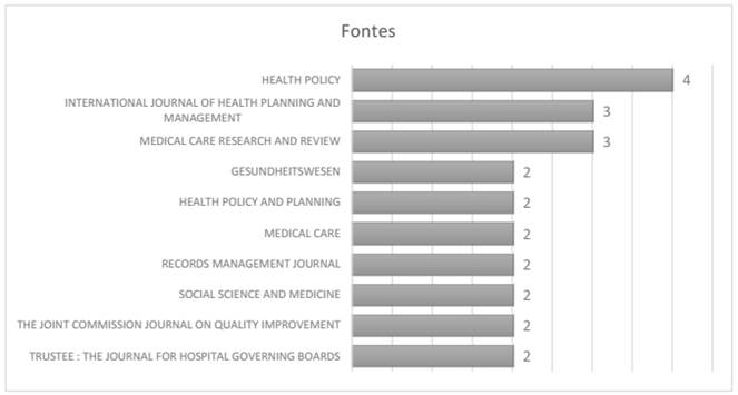 Entre as 104 fontes de publicação de artigos, foram identificadas 92 revistas e 12 atas de conferências (proceedings). Dez revistas apresentam maior número de publicações (entre quatro e dois artigos), destacando-se a Health Policy, com quatro artigos. Não se observou uma especialização acentuada em relação às demais revistas. Como se pode ver no Gráfico 2, as dez principais revistas foram destacadas, com mais de um artigo publicado, enquanto as 82 restantes publicaram apenas um artigo.