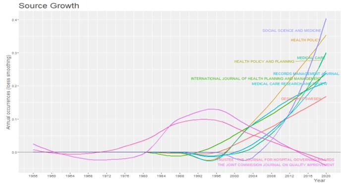Ao longo do período analisado, houve mudanças na frequência de publicação de várias revistas. Duas delas, Social Science and Medicine e Health Policy, apresentaram um aumento na relevância da produção científica na área. Já outras duas revistas, The Joint Commission Journal on Quality Improvement e Trustee: The Journal for Hospital Governing Boards, tiveram uma diminuição nessa relevância. No entanto, é preciso destacar que, entre as dez revistas mais importantes, há um domínio claro daquelas com especialidade na área de saúde, em detrimento da área de gestão, conforme podemos verificar no Grafico3.