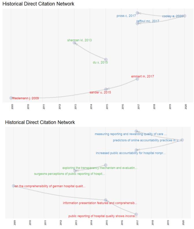 Há um grupo de artigos que relaciona relatórios públicos e transparência. Hussey, Luft, e McNamara (2014), por exemplo, sugerem relatórios públicos contínuos, por causa da importância da transparência. Robbins e Lapsley (2015) investigaram a informação on-line e o nível de transparência; Du et al. (2015) examinaram o mecanismo de transparência e o efeito dos relatórios públicos sobre os participantes individuais; Romanelli et al. (2019) detiveram-se sobre a informação disponibilizada aos consumidores de saúde, que procuram informações precisas sobre onde encontrar atendimento cirúrgico de qualidade. Tal informação foi considerada confusa pelos autores.