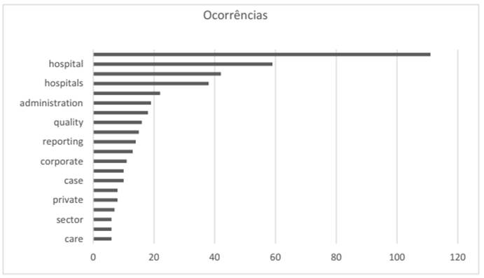 Com base nos títulos dos documentos, que refletem, em regra, os temas abordados, verifica-se a predominância de palavras que retratam não somente o objeto de estudo (os hospitais e o setor da saúde) conforme evidencia o Gráfico 5, como também os seus aspetos específicos, como a governance, a transparência e a accountability.