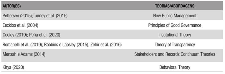 Os demais autores utilizam metodologias qualitativas baseando-se em dados documentais, páginas web das entidades ou em resultados de entrevistas ou inquéritos, os quais influenciam as conclusões dos autores. Alguns desses autores utilizam estatísticas descritivas para dar suporte aos seus estudos. De modo geral, como é demonstrado no Quadro 1, esses autores ignoram o suporte teórico ou não o explicitam, com exceção de artigos mais recentes, como o de Peña et al. (2020), que se vale da teoria institucional, teoria da legitimidade e teoria dos stakeholders, e o de Romanelli et al. (2019), cuja base é a teoria da transparência.