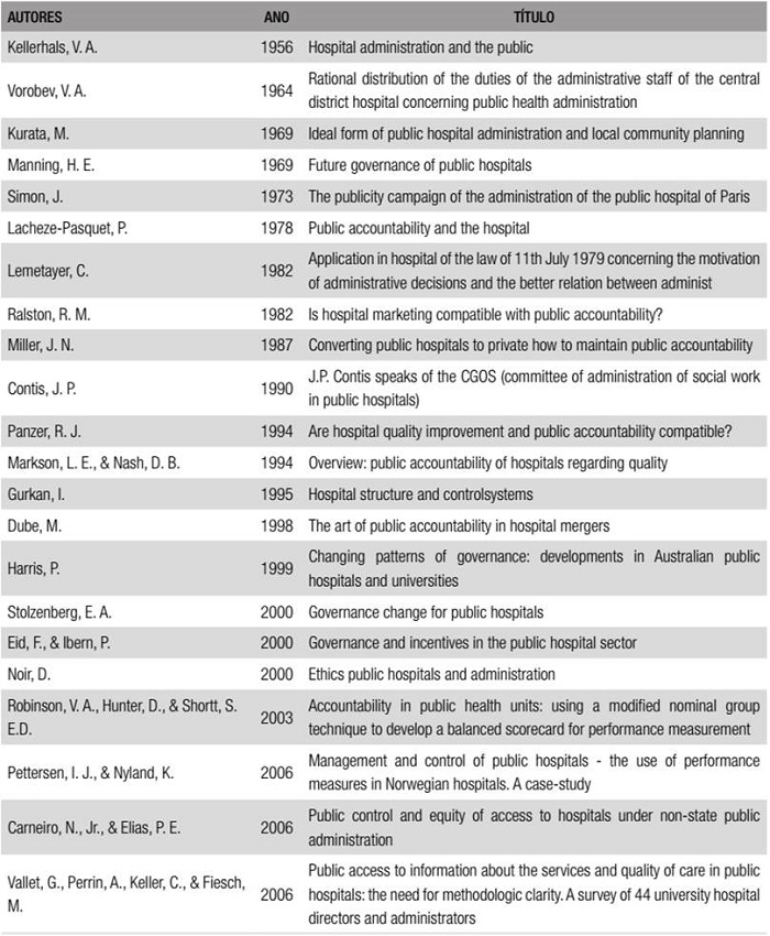 Do ponto vista temporal, este tema inicia-se com Ralston (1982) nesta bibliografia, em seu artigo “Is Hospital Marketing Compatible with Public Accountability?” e finaliza com o artigo de Cooley (2019), “Predictors of Online Accountability Practices in US Hospitals: an Exploratory Investigation”. Dos estudos identificados, dois utilizam métodos quantitativos e quatro apontam um quadro teórico de referência, especificamente a NPM, teoria institucional e teoria dos stakeholders, ressaltando-se que as fontes de informação são maioritariamente oriundas de documentos, entrevistas, questionários e sítios da web.
