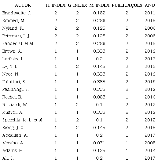 Contribuíram para as publicações selecionadas 340 autores, com uma média de 2,58 autores por documento. A maioria das publicações (68,8 %) foi produzida em coautoria, apenas 37 contaram com um único autor. Zhai é o autor com maior produção (três documentos) - uma publicação como primeiro autor e duas em coautoria -, seguido de um conjunto de autores com dois documentos cada, tal como apresentado na Tabela 1. O fator de impacto desses autores é relativamente modesto, o valor do seu H-index máximo é 2.