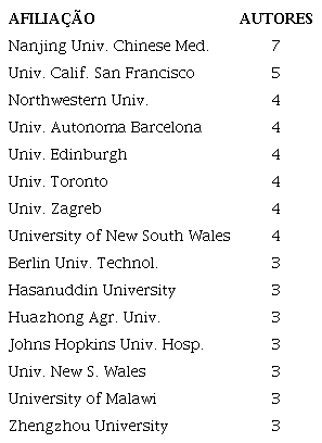 A Nanjing University of Chinese Medicine é a instituição com maior número de afiliados (7), seguida da Universidade de Califórnia, em São Francisco (5), e das universidades Northwestern, Barcelona, Edimburgo, Toronto, Zagreb e New South Wales, todas com 4 autores afiliados.