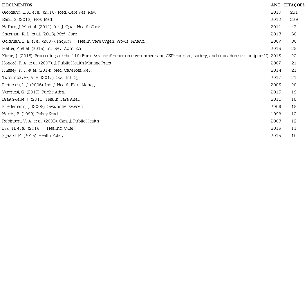 A revisão sistemática da literatura revelou um forte dinamismo na produção de artigos sobre a transparência e a accountability na governance dos hospitais públicos nos últimos dez anos, com uma clara assimetria geográfica na autoria, visto que se observa acentuada preponderância de: Estados Unidos da América (EUA), China, Reino Unido, Alemanha e Austrália. Portugal apresenta apenas uma publicação sobre o tema.