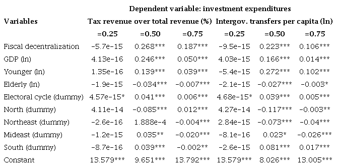 The analyses of investment expenditures and the measurements of fiscal decentralization were both statically insignificant in the first quartile, whereas the median and third quartile had statistically significant and positive effects for tax revenue over total revenue as well as for intergovernmental transfers per capita.