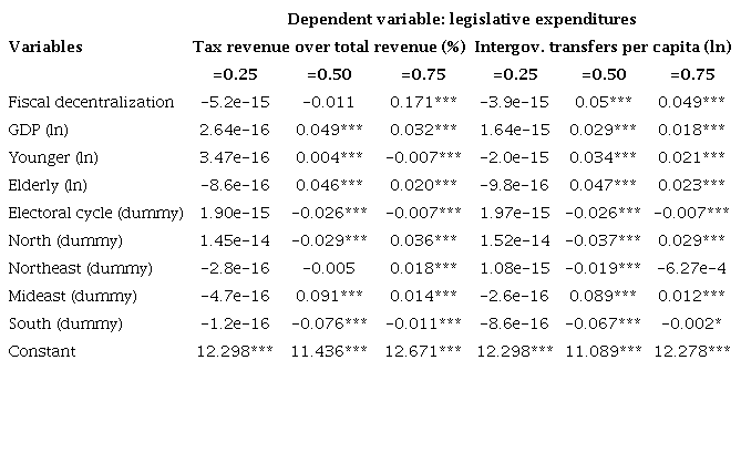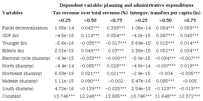 In relation to functional classification, the coefficients estimated for fiscal decentralization and quartiles are described in Table 7. Legislative expenditures, when fiscal decentralization is measured by tax revenue over total revenue, displayed positive significant and statistically effects just in the third quartile. On the other hand, when fiscal decentralization is measured by intergovernmental transfers per capita, the coefficients estimated for the median and the third quartile were statistically significant and positive. Similar results were observed for planning and administrative expenditures. For these types of expenditure, tax revenue over total revenue was statistically significant and positive for the median and the third quartile, while intergovernmental transfers per capita was statistically significant and positive for the median and for the third quartile.
